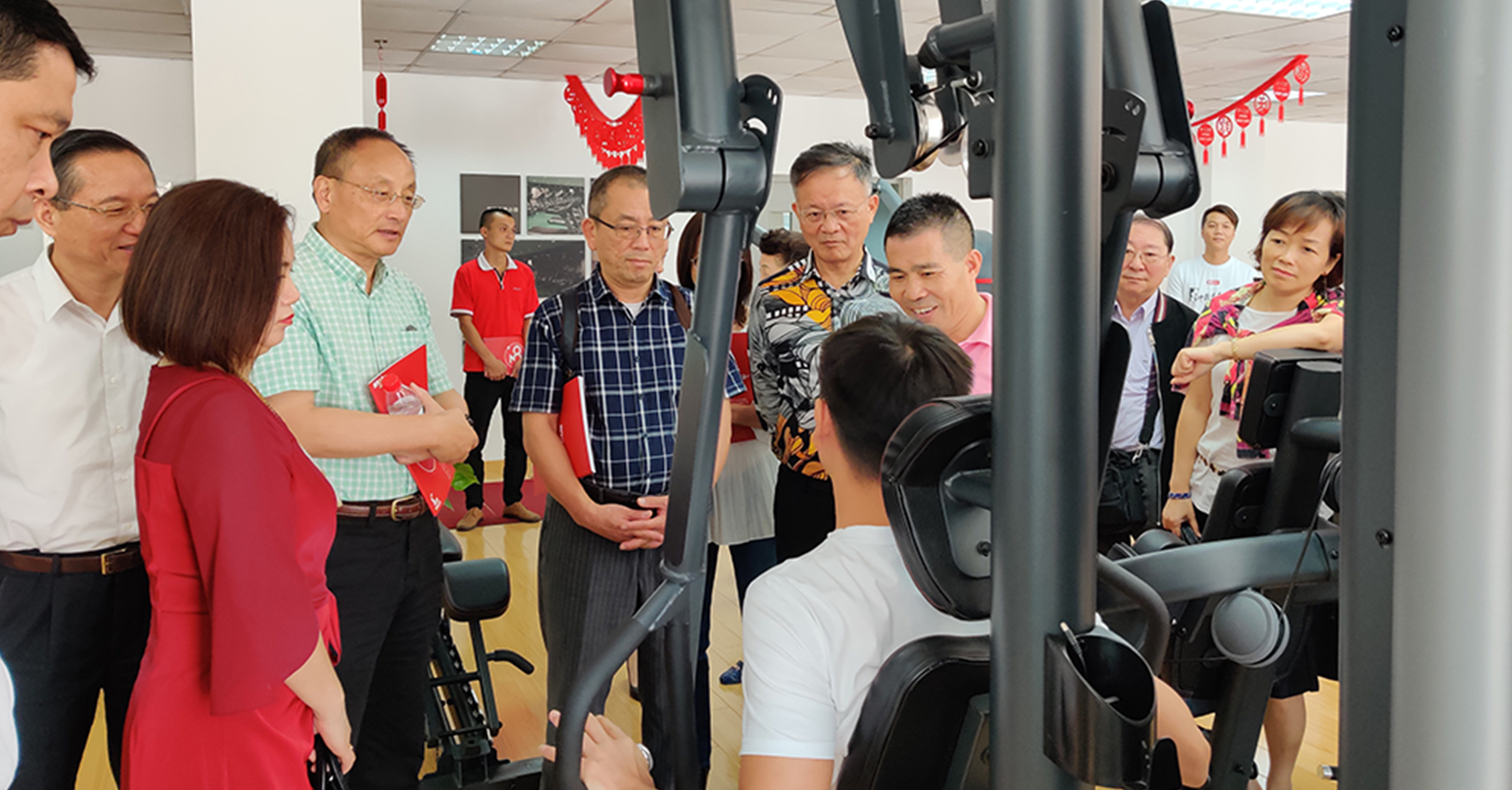 首先,来宾一行参观考察了jiuyou九游官网的文化长廊,对我司的发展历程、企业文化、企业特色等方面进行初步了解。在参观一楼与负一楼展厅过程中,来宾一行对jiuyou九游官网种类齐全的健身器材表现出浓厚的兴趣。